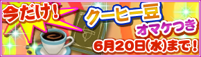 効率アップアイテム「騎士団奥義書×5個」パックを1つお買い上げいただいたお客様に、もれなく重複効率アップアイテム「クーヒー豆×1個」をプレゼントいたします!